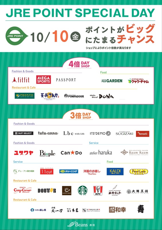 トピックス 10月度 JRE POINT3倍・4倍DAY開催スケジュール お得にポイントゲット♪ JRE POINTインセンティブ開催スケジュールです。10月10日(金)にJRE POINT3倍デーを開催します。また一部ショップではなんと4倍デーも開催!是非ご来店くださいませ♪ tweetする Facebookでシェアする LINEで送る