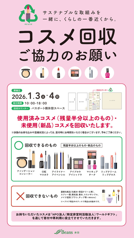 ビーンズ赤羽 コスメ回収のお知らせ|トピックス|ビーンズ赤羽 | JR埼京線・京浜東北線・高崎線・東北本線「赤羽駅」直結のショッピングセンター