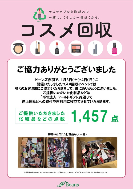 【コスメ回収】ご協力ありがとうございました。|トピックス|ビーンズ赤羽 | JR埼京線・京浜東北線・高崎線・東北本線「赤羽駅」直結のショッピングセンター