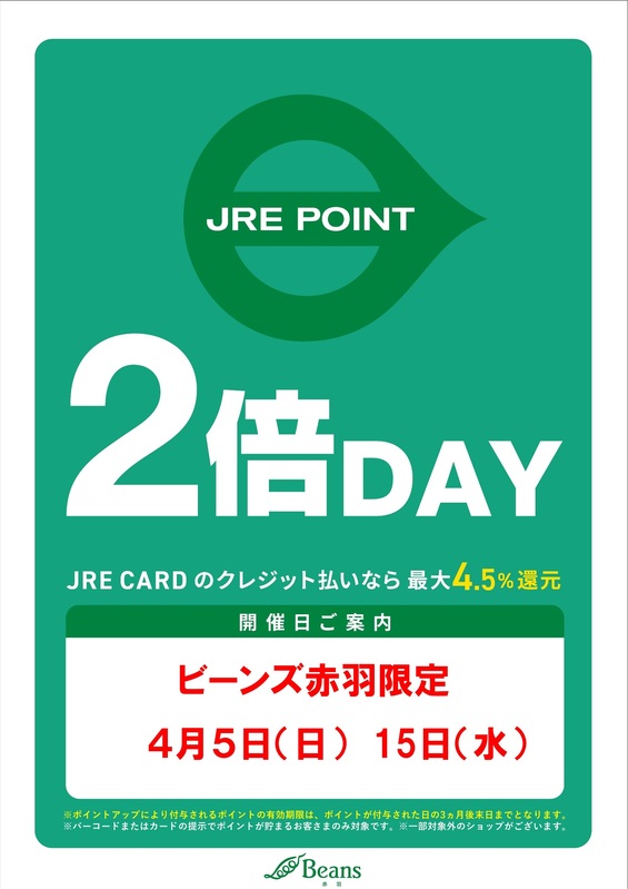 トピックス 4月度 ビーンズ赤羽JRE POINT2倍DAYスケジュール おトクにポイントゲット♪ 4月度のビーンズ赤羽JRE POINT2倍DAYスケジュールです。※ポイントアップ分のポイントの有効期限は2026年7月末日です。 tweetする Facebookでシェアする LINEで送る