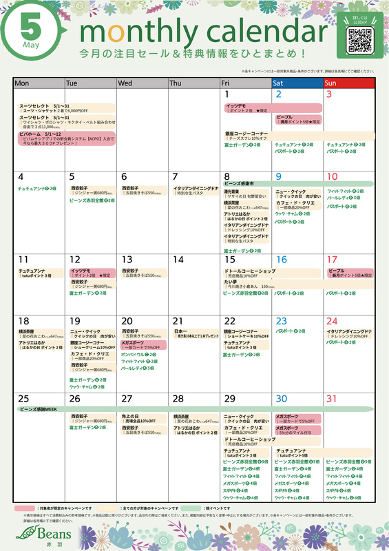 ビーンズ赤羽 5月度マンスリーカレンダー|トピックス|ビーンズ赤羽 | JR埼京線・京浜東北線・高崎線・東北本線「赤羽駅」直結のショッピングセンター