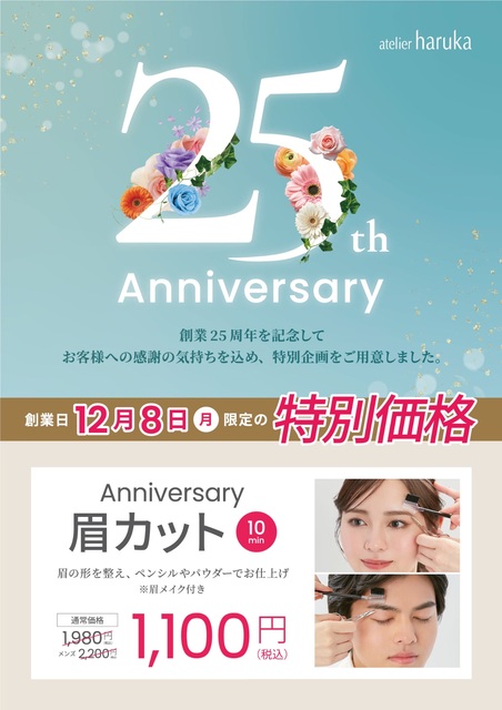 ビーンズ赤羽をご利用の皆様、こんにちは✨ アトリエはるかは今年で25周年を迎えようとしています! 日頃ご利用くださるお客様に感謝を込めて、大人気メニューの【眉カット】を12月8日限定で1100円でご案内しております! ネットが×でもお電話ください✨是非ご予約お待ちしております!