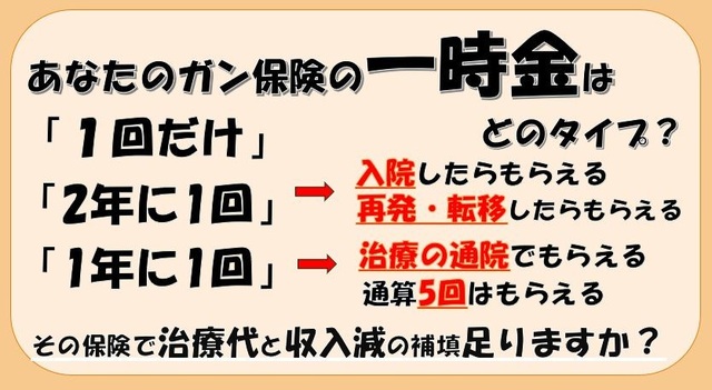 こんにちは!保険テラスでは、がん保険の取り扱いを強化しています。 少子高齢化により『入院の短期化』が進んでおります。これはがんも同様です。 しかし、中には『1回限り保障』『がんで入院したら』など、今の医療事情では厳しい条件のものもございます。 加入中のがん保険にこのような文言はありませんか? 保険テラスでは、このような保険から『機能する保険』へシフトさせるお手伝いをしております。 まずは一緒に現状把握をしてみましょう!ご来店心よりお待ちしております。