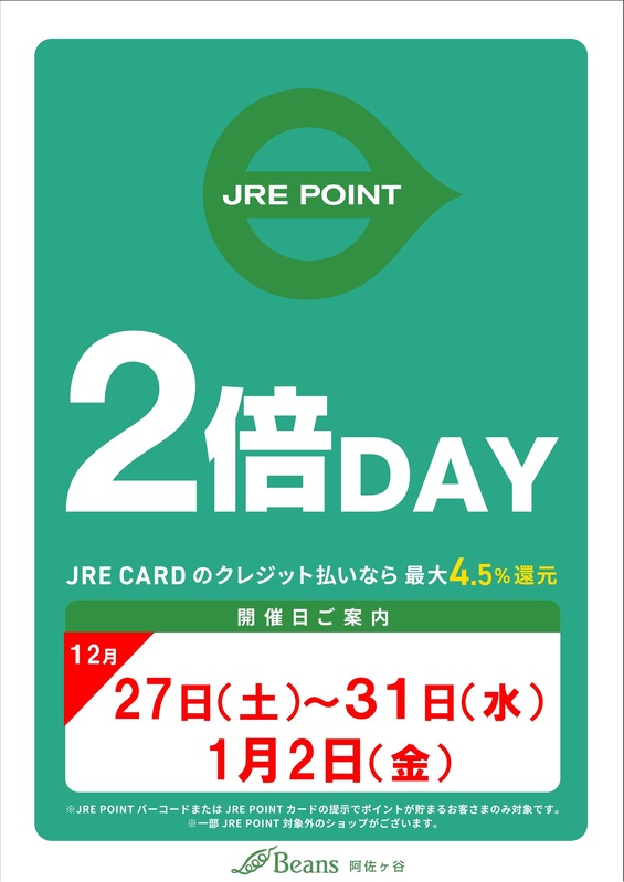 12月のJRE POINT2倍デー|トピックス|ビーンズ阿佐ヶ谷 | JR中央線・総武線阿佐ケ谷駅直結のショッピングセンター