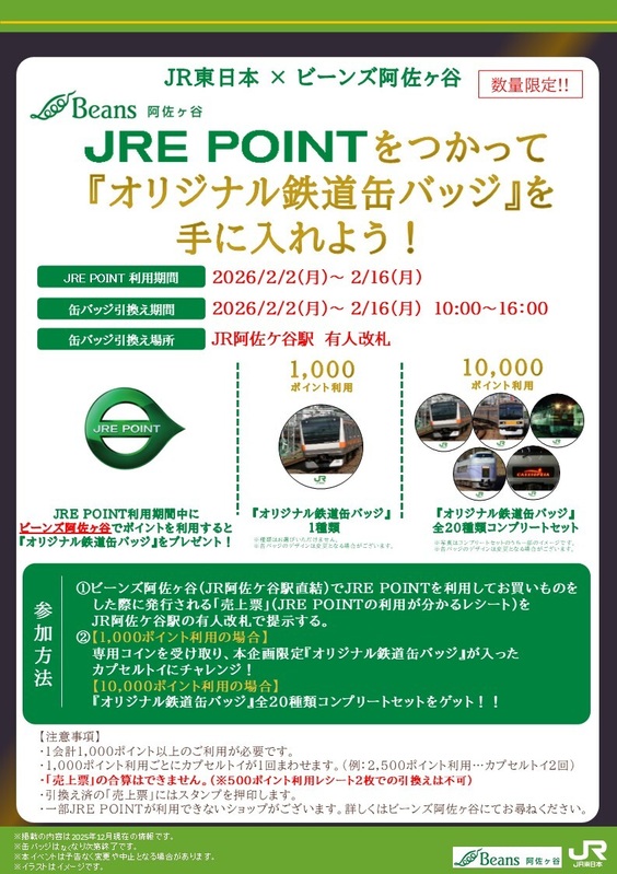 JRE POINTをビーンズ阿佐ヶ谷で利用して「オリジナル鉄道缶バッチ」を手に入れよう!!