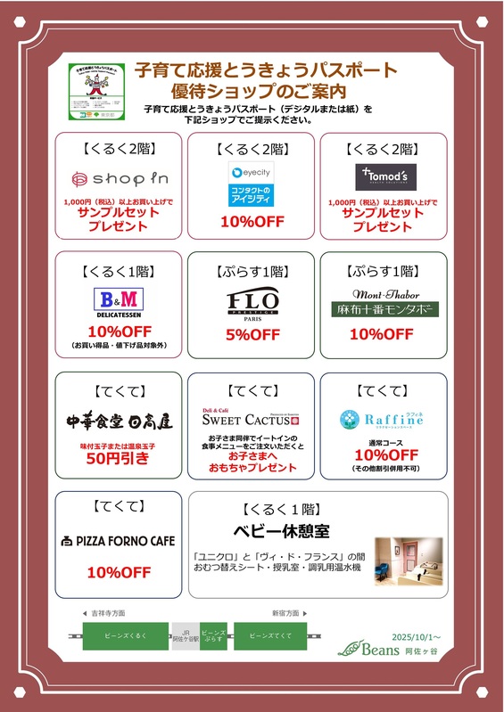 トピックス 「子育て応援とうきょうパスポート」のご案内 「子育て応援とうきょうパスポート」を対象ショップでご提示いただくと優待が受けられます!また、ビーンズくるくでは1階にベビー休憩室を設置、エレベーターもご利用いただけるようになりました。 ぜひご利用ください。 子育て応援とうきょうパスポートとは?(東京都福祉保健局) tweetする Facebookでシェアする LINEで送る