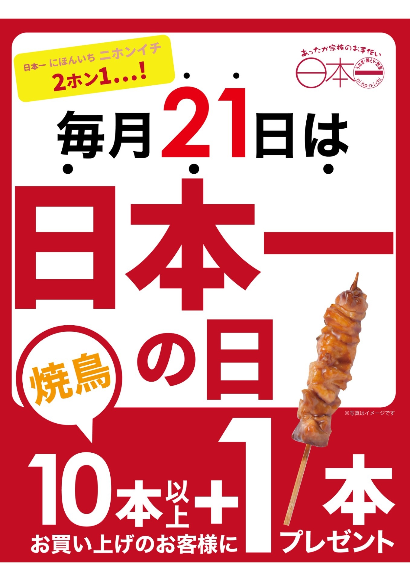 毎月21日は日本一の日! 焼鳥10本以上のお買上げで、お好きな焼鳥1本プレゼント※一部商品を除く。 ご来店お待ちしております。
