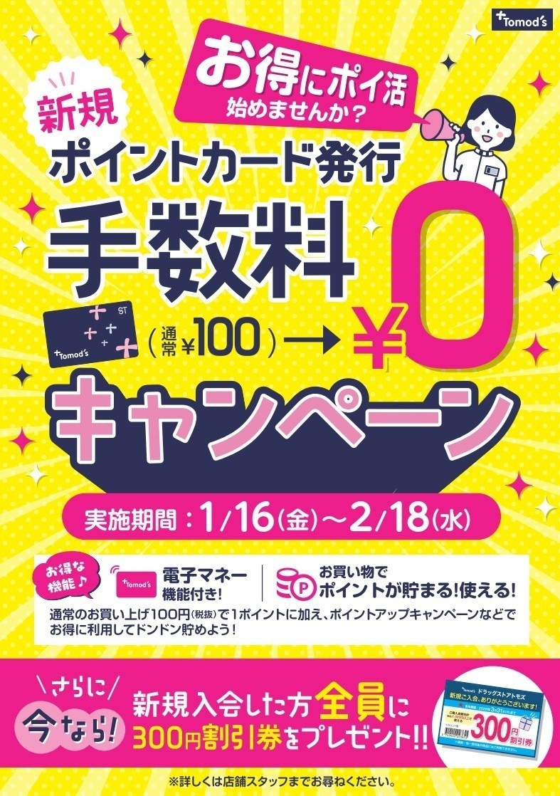 2月18日までの期間限定で新規ST(トモズ)ポイントカードの発行手数料が無料❗ ポイントカードは税抜き100円で1ポイント貯めることができ、貯まったポイントは1ポイント1円分としてお会計時にご利用いただけます さらに!今なら新規ご入会の方全員に300円引き券をプレゼント中です😊 (お得なクーポンが配信されるトモズアプリもおすすめです✨)