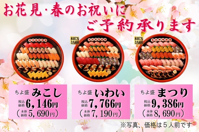 お花見や、卒業、卒園、入学、入園、新生活と 春は集まる機会やお祝いごといっぱい! そんな時には、ちよだ鮨の丸桶がおすすめです。 置くだけで食卓を華やかに彩る寿司盛合せ。 3~5人前、3種類を取りそろえています。 ご予約承り中!お電話、ご来店にてお気軽にどうぞ。