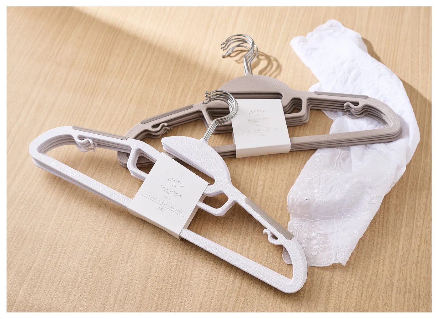 フック下に切れ込みがあり、首元の伸びを防止しながらハンガーにかけられます。キャミソールなどの紐をかけられるフック+ずれ落ち防止の滑り止めも付いています。