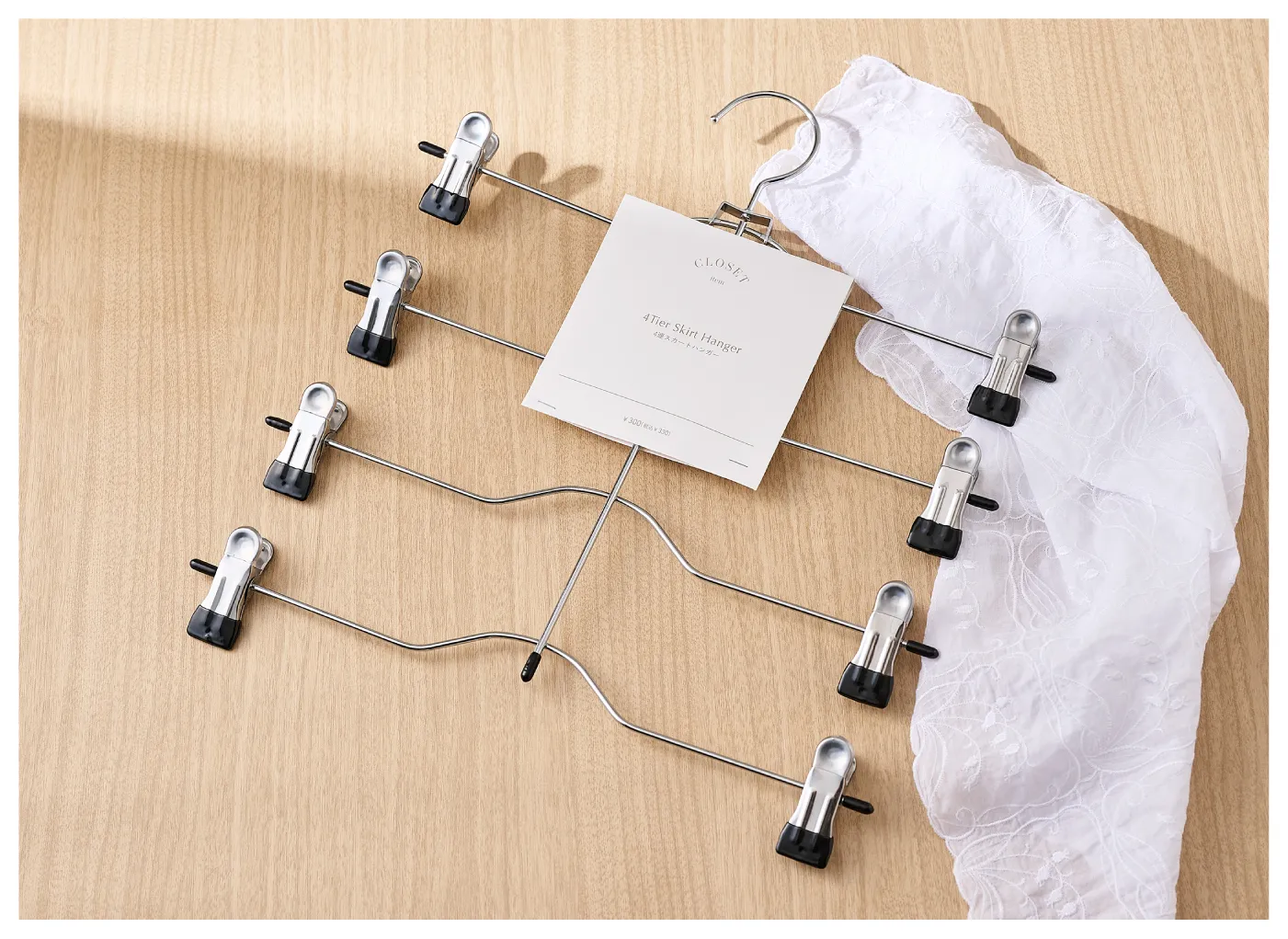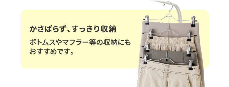 1本でスカート4枚分を掛けられるので、クローゼットの収納スペースを確保できます。ピンチ部分の幅を調節できるので、子供服やウエストの細いスカートもかけられます。