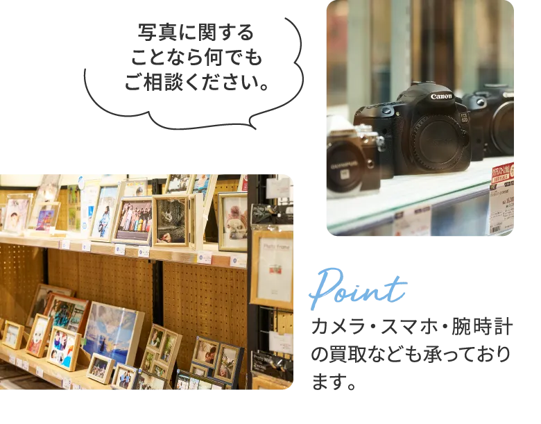 証明写真も予約不要で最短10分仕上げ、カメラの買取も実施しております。皆さまのご来店をお待ちしております。