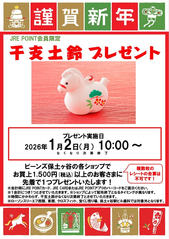 ビーンズ保土ヶ谷の各ショップで1回のお会計が税込1,500円以上のJRE POINT会員のお客様を対象に干支土鈴をプレゼントいたします。