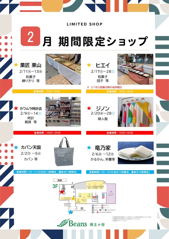 期間限定ショップ 2月 期間限定ショップのご案内 2月の期間限定ショップのご案内です 皆様のご来店を心よりお待ちしております。 参加方法・参加料金2月18日㈬は休館日となっております (館内一部営業店舗あり) tweetする Facebookでシェアする LINEで送る