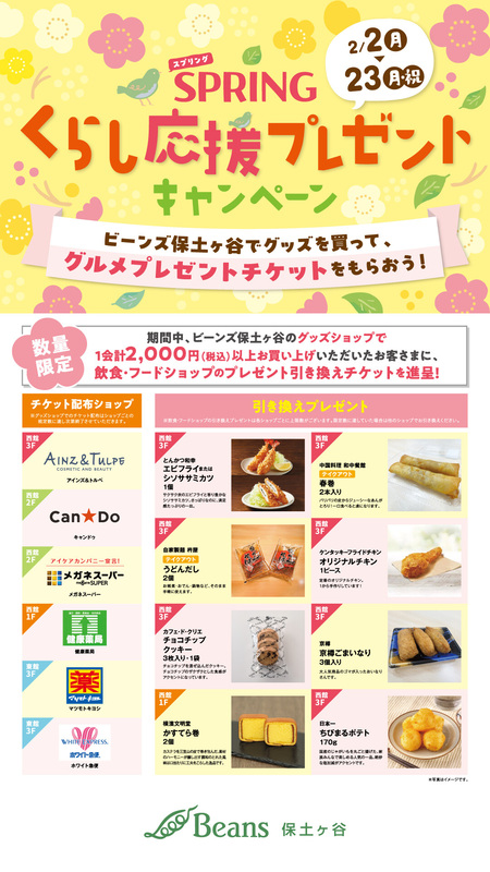 トピックス 暮らし応援プレゼントキャンペーン開催! 期間中、ビーンズ保土ヶ谷のグッズショップで1会計2,000円(税込)以上お買い上げいただいたお客様に、「飲食・フードショップ」のプレゼント引換券をプレゼント! 開催日時 2月2日(月)~2月23日(月) tweetする Facebookでシェアする LINEで送る