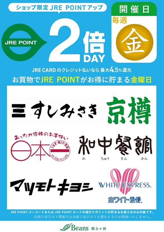 トピックス 毎週金曜日は6ショップ限定2倍DAY! 【毎週金曜日対象ショップ】 ( 西館 ) すしみさき、京樽、日本一、和中餐館 ( 東館 ) マツモトキヨシ、ホワイト急便是非ご利用ください!! 開催日時 毎週金曜日 tweetする Facebookでシェアする LINEで送る