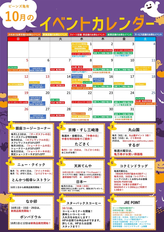 ビーンズ亀有の『10月号イベントカレンダー』でお得な情報をチェック!