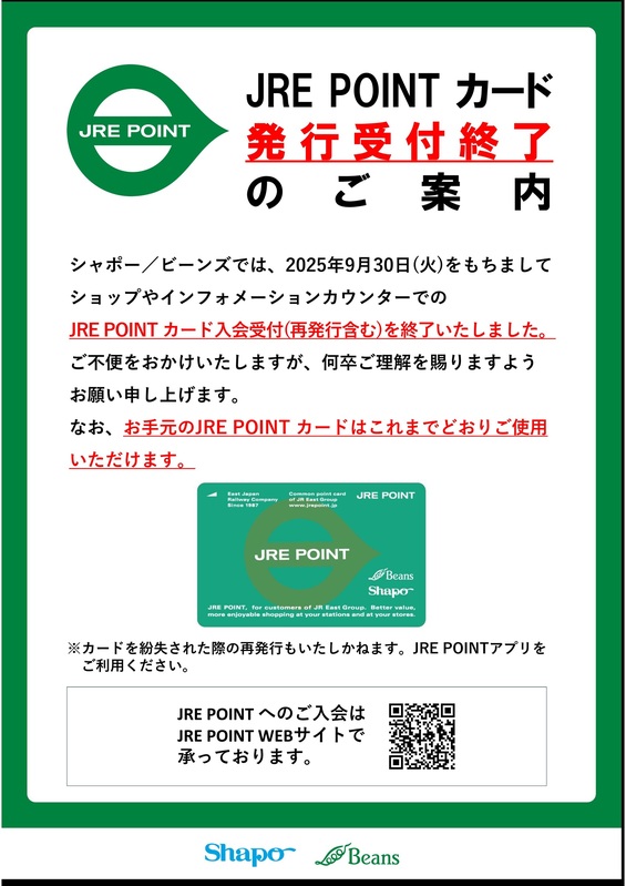 シャポー/ビーンズでは2025年9月30日(火)をもちまして、ショップでのJRE POINTカード入会受付(紛失等による再発行含む)を終了いたしました。
