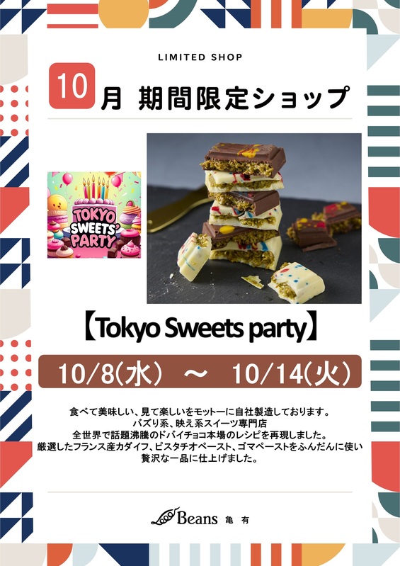 期間限定ショップ 【Tokyo Sweets Party】期間限定出店のお知らせ いつもビーンズ亀有をご利用頂きまして、ありがとうございます。10/8(水)から10/14(火)の期間、ビーンズ亀有中央イベント広場に「Tokyo Sweets party」が期間限定で出店いたします。食べて美味しい、見て楽しいスイーツを是非、ご賞味下さいませ。お客さまのご来店をお待ちいたしております。 tweetする Facebookでシェアする LINEで送る