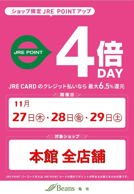 11/27(木)~11/29(土)の3日間限定で、ビーンズ亀有館内でJRE POINT4倍デーを開催します!