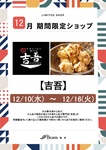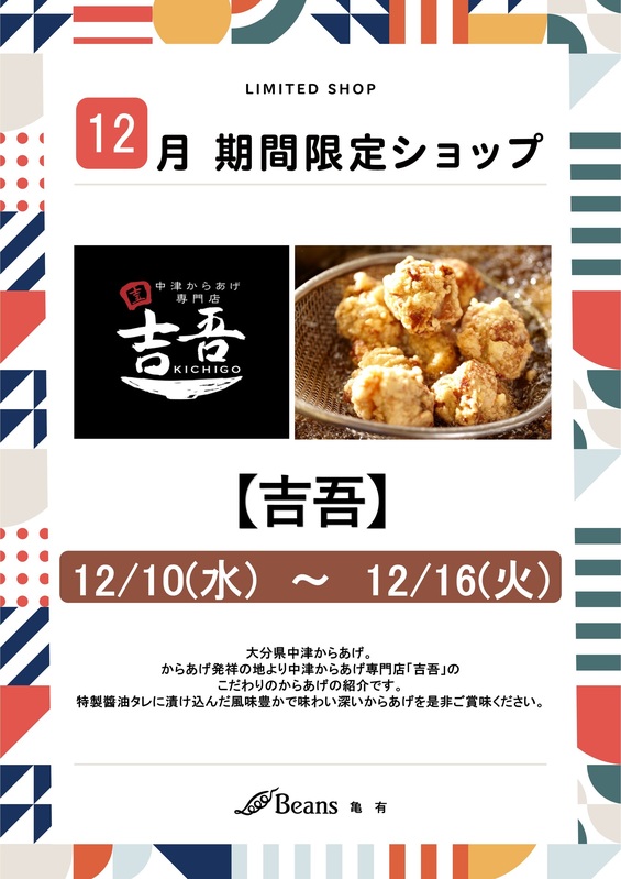 期間限定ショップ 【吉吾】期間限定出店のお知らせ いつもビーンズ亀有をご利用頂きましてありがとうございます。12/10(水)から12/16(火)の期間、ビーンズ亀有中央イベント広場に大分県中津からあげ専門店の「吉吾」が期間限定出店いたします。特製醤油タレに漬け込んだ風味豊かで味わい深いからあげを是非、ご賞味下さいませ。 tweetする Facebookでシェアする LINEで送る