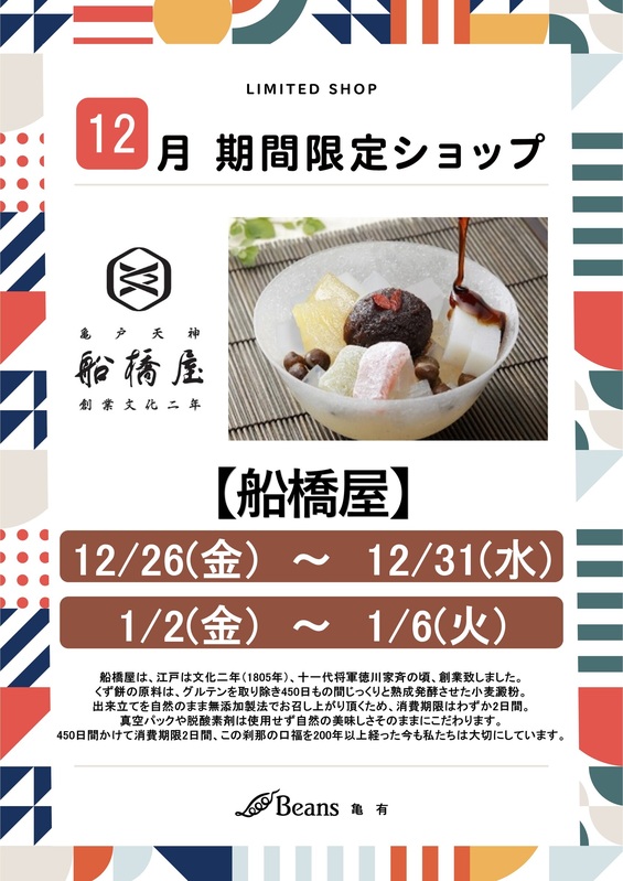 期間限定ショップ 【船橋屋】期間限定出店のお知らせ いつもビーンズ亀有をご利用頂きありがとうございます。12/26(金)から1/6(火)の期間、ビーンズ亀有中央イベント広場にくず餅が有名な「船橋屋」が期間限定出店いたします。年の瀬のご挨拶、新年のご挨拶として是非、お買い求め下さいませ。お客さまのご来店をお待ちしております。(1/1、ビーンズ亀有は全館休業させていただきます) tweetする Facebookでシェアする LINEで送る