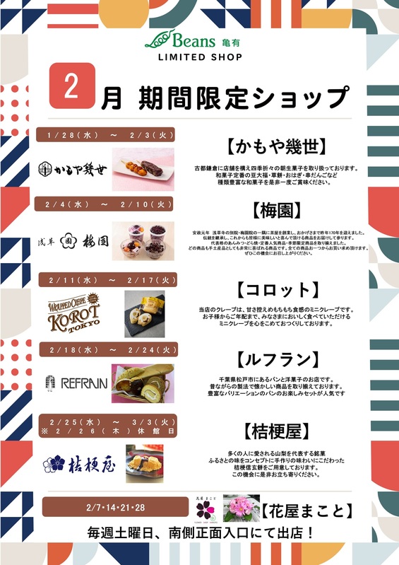 トピックス 2月期間限定ショップのお知らせ 2月のビーンズ亀有期間限定ショップのお知らせです。ビーンズ亀有初出店のショップもございます。お客さまのご来店を心よりお待ちしております。 tweetする Facebookでシェアする LINEで送る