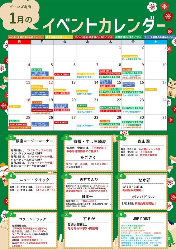 ビーンズ亀有の『1月号イベントカレンダー』でお得な情報をチェック!