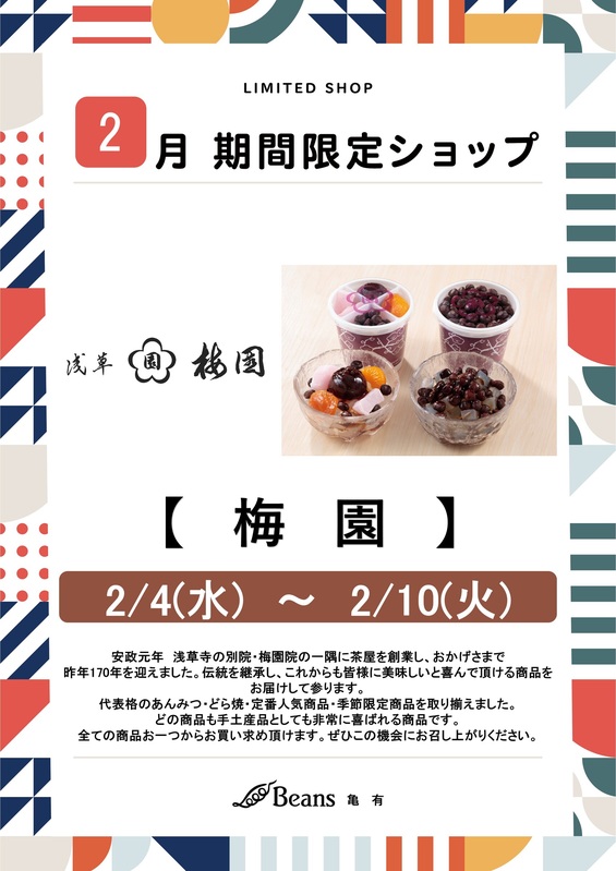 トピックス 【浅草梅園】期間限定出店のお知らせ いつもビーンズ亀有をご利用頂きありがとうございます。2/4(水)から2/10(火)の期間、ビーンズ亀有中央イベント広場に「浅草梅園」が期間限定出店いたします。代表格の「あんみつ」「どら焼」を是非ご賞味下さいませ。お客さまのご来店をお待ちしております。 tweetする Facebookでシェアする LINEで送る