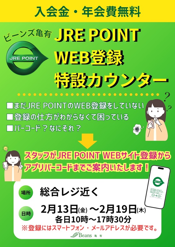 ビーンズ亀有では、JRE POINT WEB登録特設カウンターを設置いたします!
