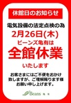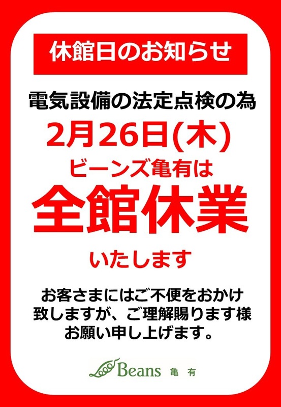 トピックス 休館日のお知らせ いつもビーンズ亀有をご利用頂きありがとうございます。ビーンズ亀有は電気設備の法定点検の為、「2月26日(木)は休業」させて頂きます。お客さまにはご不便をおかけしますが、何卒ご理解賜りますよう、お願いいたします。 tweetする Facebookでシェアする LINEで送る