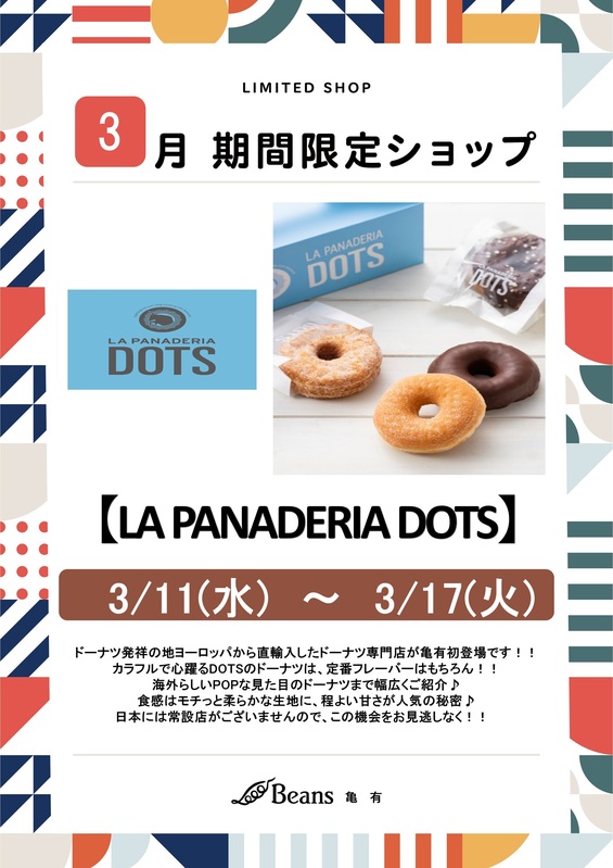 期間限定ショップ 【LA PANADERIA DOTS】期間限定出店のお知らせ いつもビーンズ亀有をご利用頂きましてありがとうございます。3/11(水)から3/17(火)の期間、ビーンズ亀有中央イベント広場に「LA PANADERIA DOTS」が初出店いたします。カラフルで心躍るDOTSのドーナツを是非、ご賞味下さいませ。 tweetする Facebookでシェアする LINEで送る