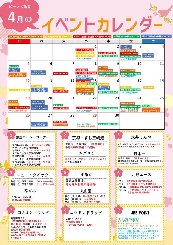 ビーンズ亀有の『4月号イベントカレンダー』でお得な情報をチェック!