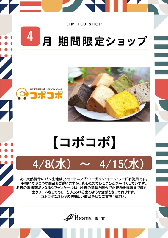 期間限定ショップ 【コボコボ】期間限定出店のお知らせ いつもビーンズ亀有をご利用頂きましてありがとうございます。4/8(水)から4/15(水)の期間、ビーンズ亀有中央イベント広場に「コボコボ」が期間限定出店いたします。看板商品のシフォンケーキは、独自の製法と配合で小麦粉を極限まで減らし、生クリームなしでもしっとりとろける生のような食感となっております。是非、ご賞味下さいませ。 tweetする Facebookでシェアする LINEで送る