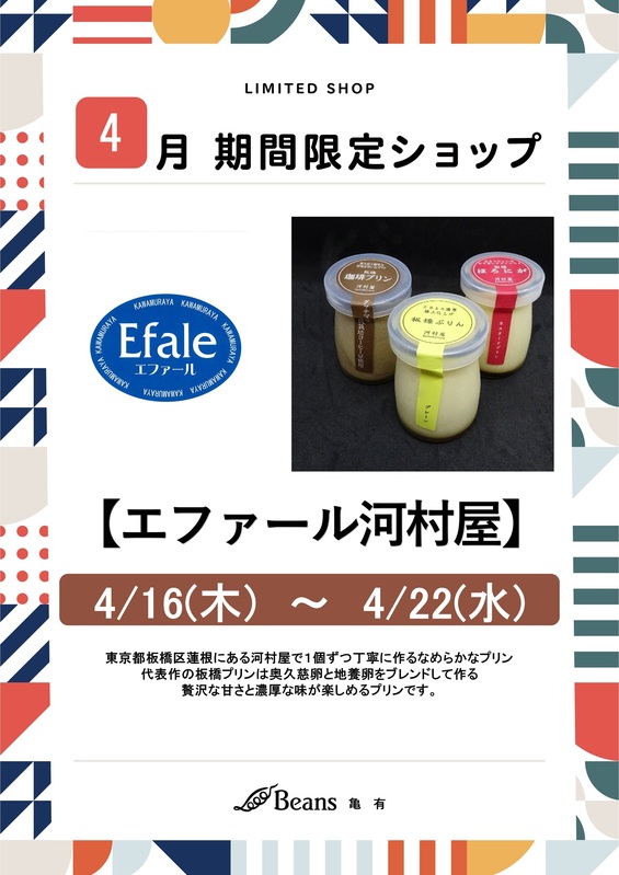 期間限定ショップ 【エファール河村屋】期間限定出店のお知らせ いつもビーンズ亀有をご利用頂きましてありがとうございます。4/16(木)から4/22(水)の期間、ビーンズ亀有中央イベント広場に「エファール河村屋」が期間限定出店いたします。代表作の板橋プリンは奥久慈卵と地養卵をブレンドして作る贅沢な甘さと、濃厚な味が楽しめるプリンです。お客さまのご来店お待ちしております。 tweetする Facebookでシェアする LINEで送る