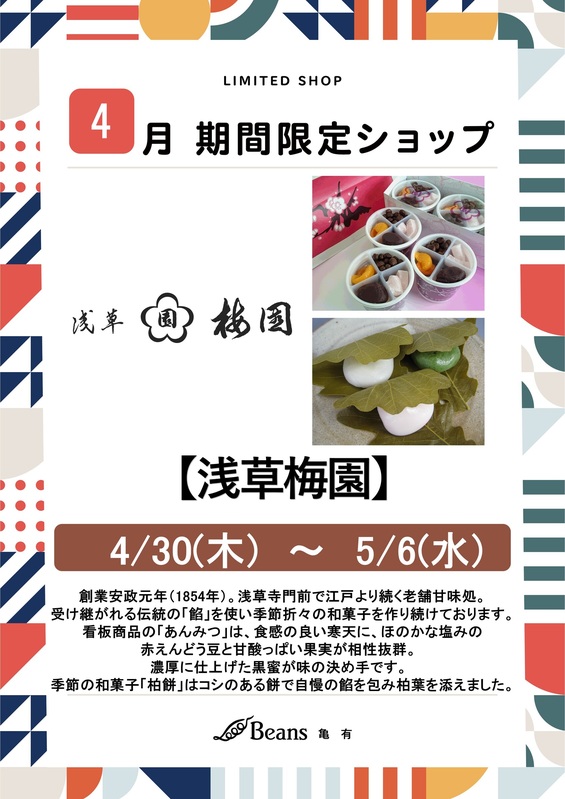 トピックス 【浅草梅園】期間限定出店のお知らせ いつもビーンズ亀有をご利用頂きましてありがとうございます。4/30(木)から5/6(水)の期間、ビーンズ亀有中央イベント広場に「あんみつ」が看板商品の浅草梅園が期間限定出店いたします。お客さまのご来店をお待ちしております。 tweetする Facebookでシェアする LINEで送る