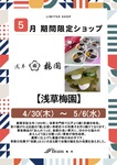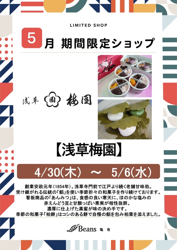 期間限定ショップ 【浅草梅園】期間限定出店のお知らせ いつもビーンズ亀有をご利用頂きましてありがとうございます。4/30(木)から5/6(水)の期間、ビーンズ亀有中央イベント広場に「あんみつ」が看板商品の浅草梅園が期間限定出店いたします。お客さまのご来店をお待ちしております。 tweetする Facebookでシェアする LINEで送る