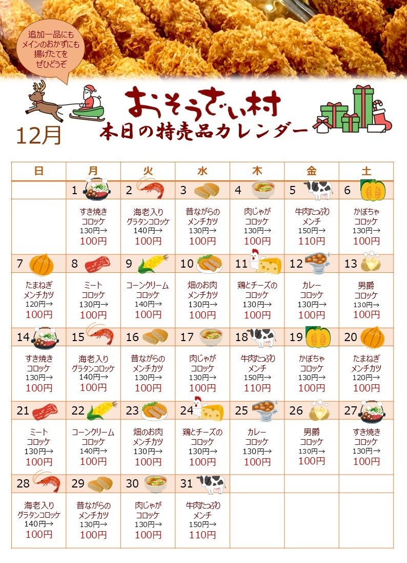 大人気【おそうざい村】揚物各種12月の特売品カレンダー!