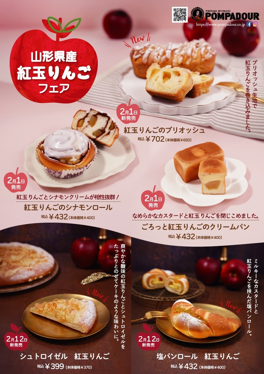 ポンパドウルでは2/1より山形県産紅玉りんごフェアを開催いたしております。紅玉りんごを使用したパンが期間限定で数多く登場しております。是非、ご賞味下さいませ。
