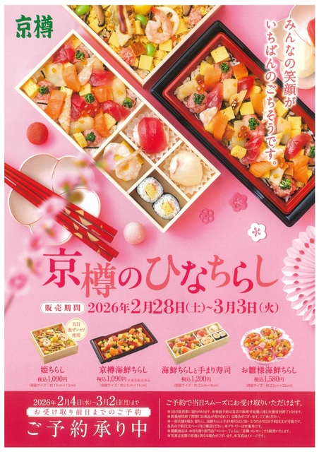 京樽・すし三崎港より、ひなまつりを彩る、 ひなちらしのご案内です。 お受け取り前日までのご予約を承っております。 桃の節句は、大切なお子さまの成長や健康を祝う、 古くからの日本の伝統行事です。 ぜひ、京樽のひなちらしで、 大切な一日に彩を添えてみませんか、 商品の販売個数や種類につきましては、 店舗によって限りがある場合がございます。 詳しくは、店舗スタッフへお問い合わせ下さい。