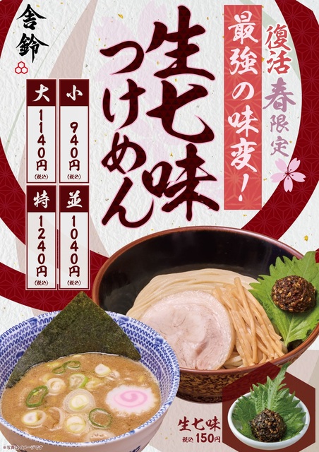 舎鈴では2/25(水)より、期間限定で「生七味つけん」を販売致しております。十数種類の素材を調合した生七味は、風味豊かな香りと爽やかな辛みが特徴です。是非、ご賞味下さいませ。