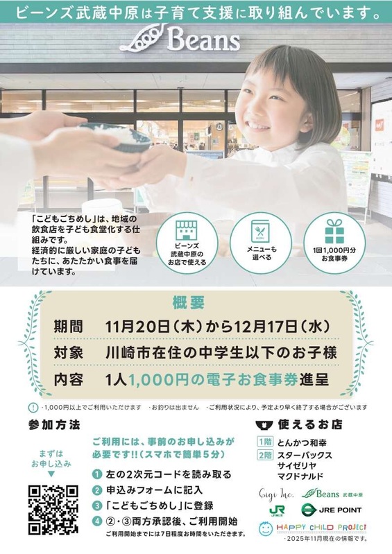JRE POINT会員さまからのポイント寄付をもとに、「こどもごちめし」を通じて発行された食事チケットを提示することで、子どもたちが駅直結「ビーンズ武蔵中原」の飲食店で食事を楽しむことができます。