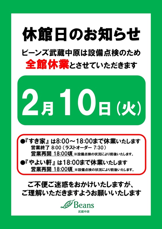 トピックス 休館日のお知らせ ビーンズ武蔵中原は設備点検のため、2月10日(火)を全館休業とさせていただきますご不便ご迷惑をおかけいたしますが、ご理解いただきますようお願いいたします tweetする Facebookでシェアする LINEで送る