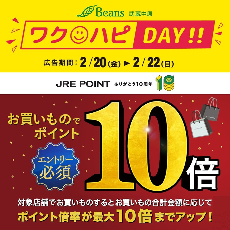 2/20(金)~22(日)は、「JRE POINT誕生祭!駅ビルでのお買いものでポイント最大10倍!」期間に開催です。