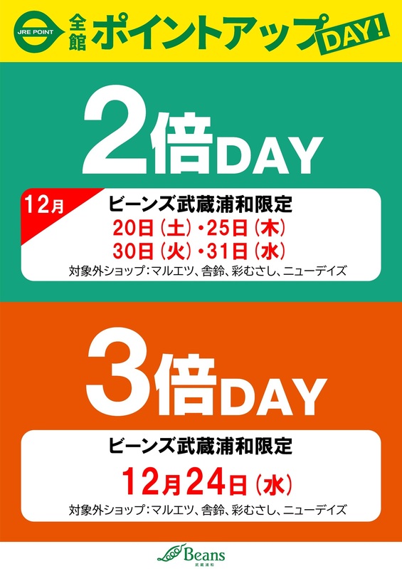 トピックス 12月のJRE POINTアップデー! 12月は 20日(土)、25日(木)、30日(火)、31日(水)でJRE POINT 2倍DAYを開催いたします! さらに、クリスマスイブの24日(水)は3倍DAY!! ぜひおトクなこの機会にお買い物ください✨ みなさまのご来店をお待ちしております。 tweetする Facebookでシェアする LINEで送る