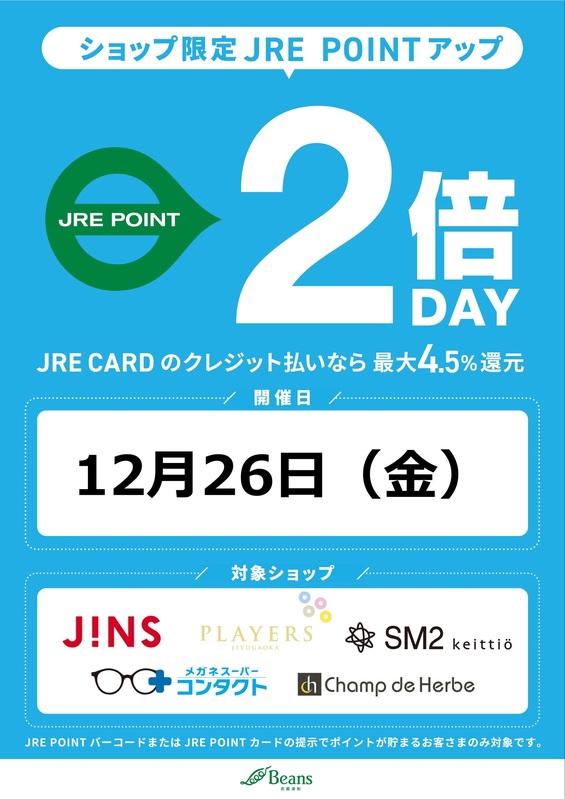 12/26(金)1Fの一部ショップ限定で2倍デーを実施します!