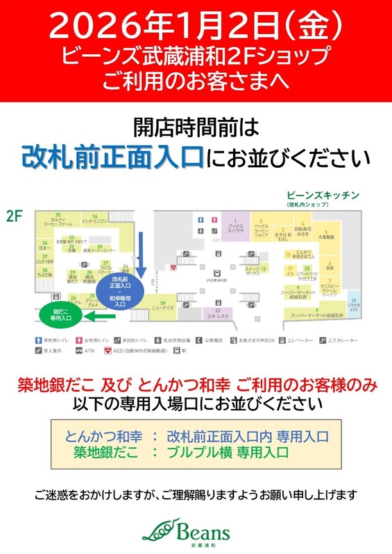 2026年1月2日(金)ビーンズ武蔵浦和2Fショップをご利用のお客さま