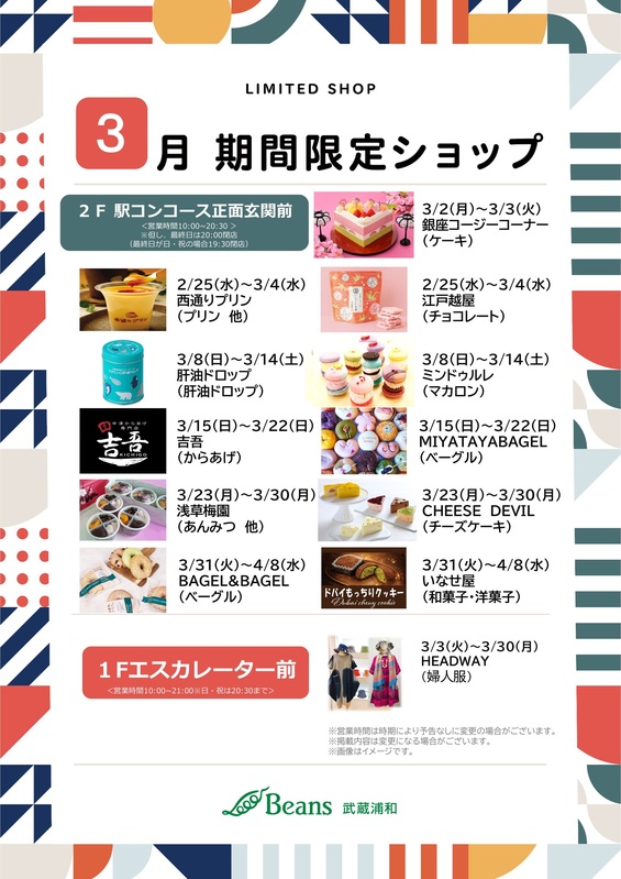 3月期間限定ショップ!|トピックス|ビーンズ武蔵浦和 | JR埼京線・武蔵野線「武蔵浦和駅」直結のショッピングセンター