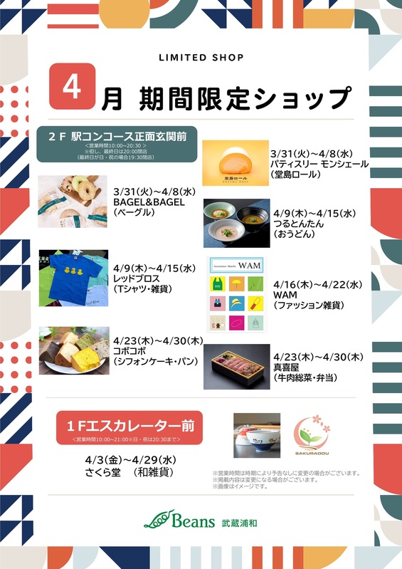 4月期間限定ショップ!|トピックス|ビーンズ武蔵浦和 | JR埼京線・武蔵野線「武蔵浦和駅」直結のショッピングセンター