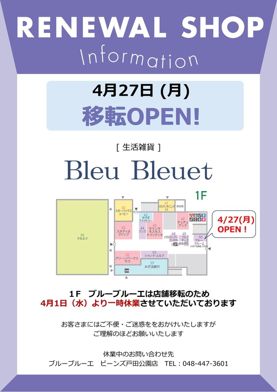 トピックス 4/27(月)リニューアルOP! 1Fブルーブルーエは4/27(月)にリニューアルオープンいたします!品ぞろえをパワーアップしてお待ちしております。お楽しみに!※4/1~4/26は休業しております。ご理解のほどお願い申し上げます tweetする Facebookでシェアする LINEで送る